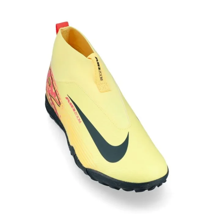 The boot is used by French superstar Kylian Mbappé Superfly 10 Academy features an enhanced heel Air Zoom device that helps you flash your speed The upper is made of NikeSkin with embedded chevrons, which help provide ball control and really give you the feeling of barefoot football Rubber outsole provides traction on grass surfaces The stretchable mesh has been upgraded from the previous generation to an adaptable knit for flexibility Dynamic Fit collar wraps around your ankle in soft, stretchy fabric for a secure feel This is a shoe with a TF outsole, which makes it suitable for use on artificial surfaces such as artificial turf and clay pitches.